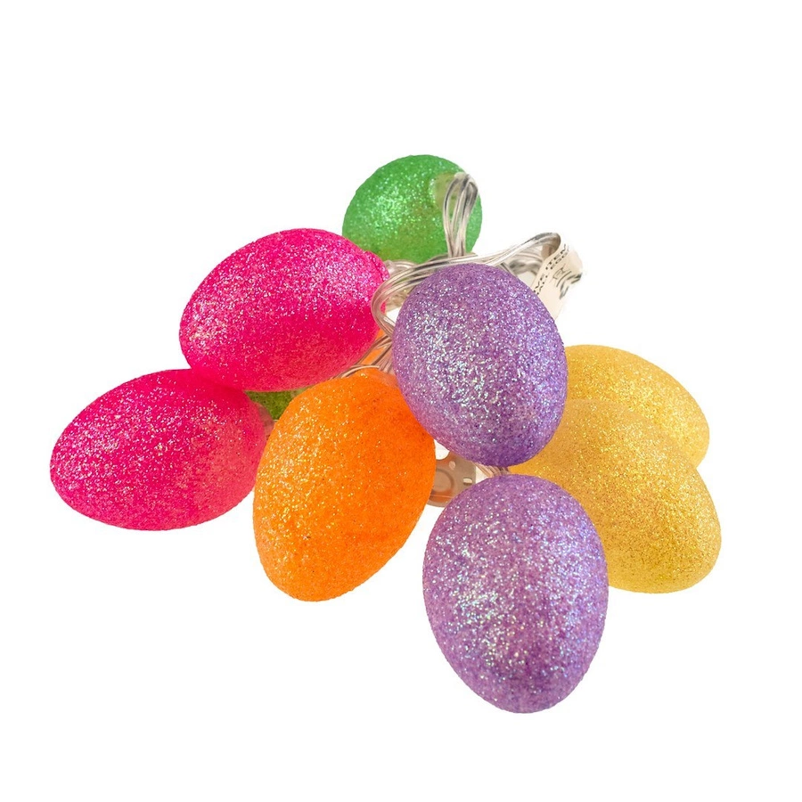 10 plastikowych, kololrowych jajek LED w rozmiarze 3*4cm, osypanych brokatem z transparentnym kablem. Odległość pomiędzy jajkami to 15cm,